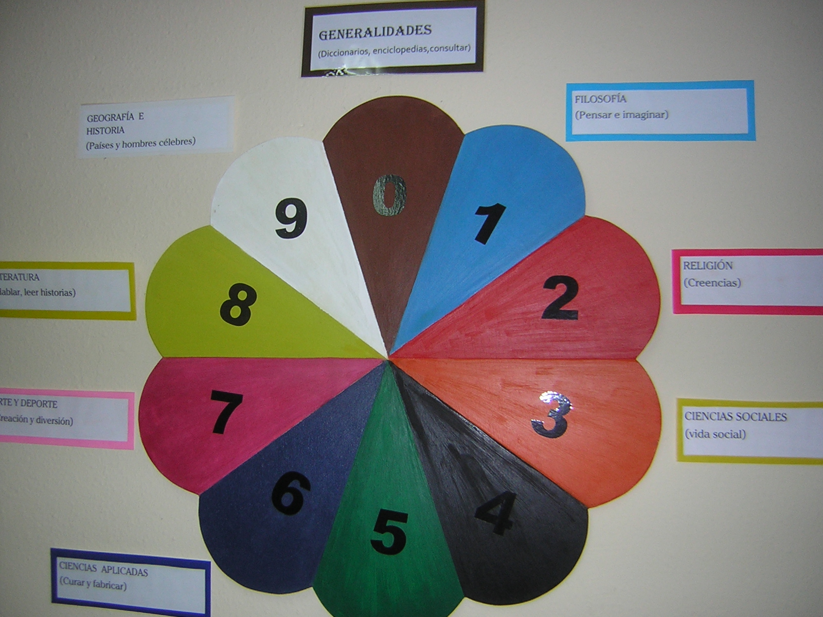 Los fondos de la biblioteca se organizan, según la Clasificación Decimal Universal (CDU), en distintos apartados con tejuelos de diferentes colores.